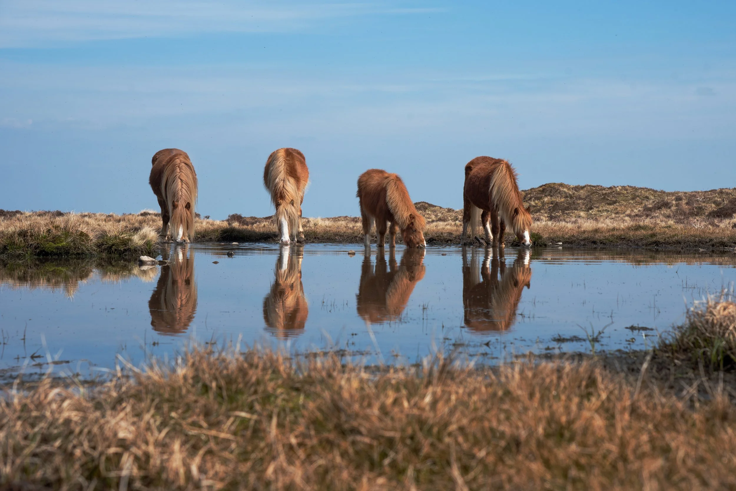 Four brown horses drinking from a small pond in a grassy field under a blue sky.